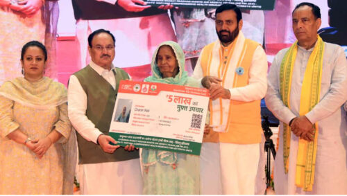 प्रधानमंत्री आयुष्मान भारत जन आरोग्य योजना के तहत 70 वर्ष व अधिक आयु वर्ग के बुजुर्गों को वयवंदन कार्ड और आयुष्मान योजना के लाभार्थियों को आयुष्मान कार्ड का वितरण भी किया। समारोह में कैंसर को मात देने वाले कैंसर चैंपियन को भी सम्मानित किया गया। समारोह में जे पी नड्डा और नायब सिंह सैनी ने उपस्थितजनों को अंग दान तथा स्वस्थ आहार – संतुलित आहार की शपथ भी दिलवाई। केंद्रीय स्वास्थ्य एवं परिवार कल्याण मंत्री जगत प्रकाश नड्डा ने प्रधानमंत्री नरेन्द्र मोदी के जन्मदिन पर रोहतक शहर के सेक्टर 2 में मियावाकी पद्धति से तैयार किए जा रहे नमो वन का उद्घाटन पौधरोपण के साथ किया। जेपी नड्डा ने मुख्यमंत्री के साथ मिलकर रोहतक वासियों संग नमो वन में करीब 10 हजार पौधे रोपित करते हुए पर्यावरण संरक्षण का संकल्प लिया।