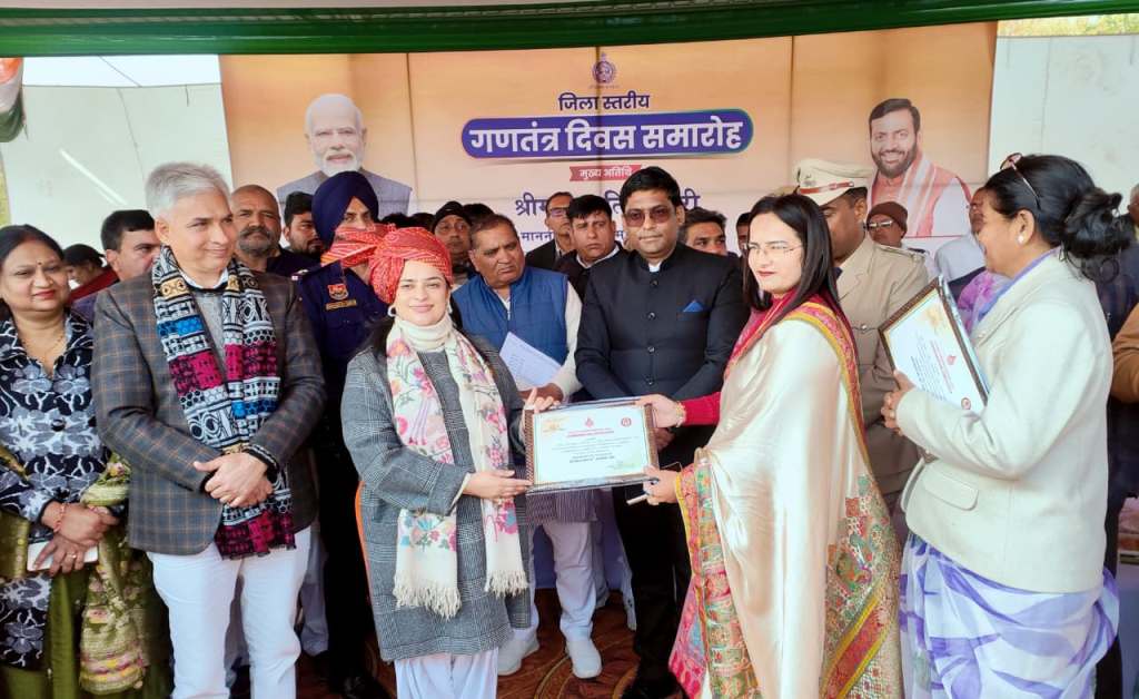 Haryana Republic Day Celebration 2026 में मंत्री श्रुति चौधरी ने विभिन्न विभागों के अधिकारियों, कर्मचारियों और सामाजिक कार्यकर्ताओं को उनके उत्कृष्ट कार्यों के लिए प्रशंसा पत्र देकर सम्मानित किया।