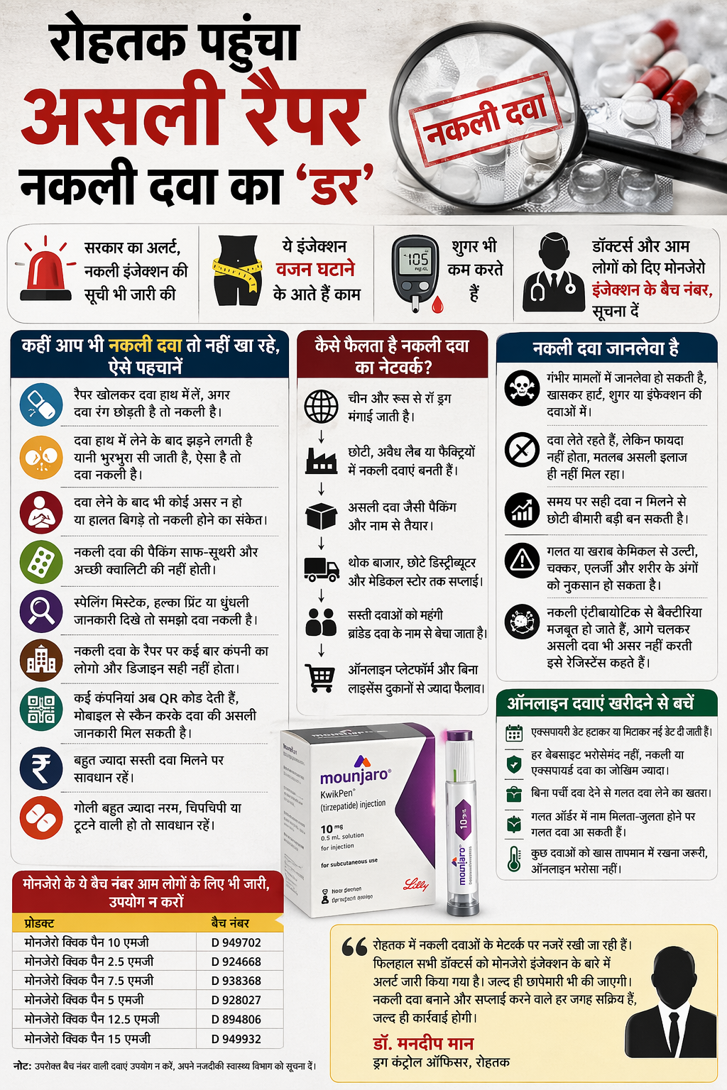 मनोज वर्मा . रोहतक। सावधान! कहीं आप भी नकली दवा तो नहीं खा रहे। इन दिनों असली रैपर में नकली दवा का धंधा चरम पर है। अब यह ‘डर’ रोहतक पहुंच चुका है। खरीदने से पहले पहचान कर लें कि दवा असली है या नकली। नकली दवाओं का नेटवर्क रडार पर है। इसे देखते हुए रोहतक में ड्रग कंट्रोलर ने अलर्ट जारी कर दिया है। दरअसल, पिछले दिनों गुरुग्राम में वजन कम करने के नकली इंजेक्शन की खेप मिलने के बाद, स्वास्थ्य विभाग एक्शन में है। सभी सरकारी और प्राइवेट डॉक्टर्स, आईएमए, हॉलसेल केमिस्ट एसोसएशन, मेडिकल स्टोर संचालकों को सचेत किया है और पत्र लिखकर नकली मोनजेरो इंजेक्शन के बैच नंबर भी बताए हैं। यह इंजेक्शन वजन और शुगर कंट्रोल करने के काम आता है। इसलिए इसे पतला होने के लिए उपयोग में लाया जाता है।