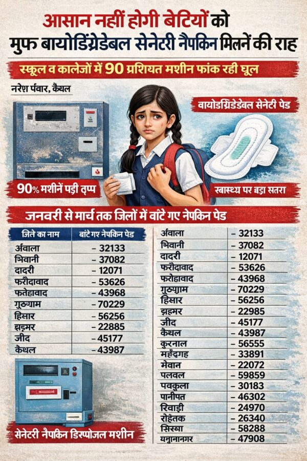 छात्राओं के स्वास्थ्य और स्वच्छता को ध्यान में रखते हुए शिक्षा विभाग ने कई वर्ष पूर्व प्रदेश के सभी राजकीय और निजी स्कूलों में बायोडिग्रेडेबल सेनेटरी पैड उपलब्ध करवाने और सेनेटरी नैपकिन डिस्पोजल मशीन लगाने के निर्देश जारी किए थे। इन निर्देशों के तहत करोड़ों रुपये खर्च कर प्रदेश के अधिकांश सरकारी स्कूलों में डिस्पोजल मशीनें लगाई गईं, लेकिन वर्तमान स्थिति यह है कि करीब 90 प्रतिशत से अधिक मशीनें खराब पड़ी हैं या धूल फांक रही हैं।